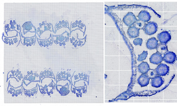 A reasonable chip design can better utilize the chip area, thereby reducing experimental costs and obtaining more experimental data. For materials with small tissues like wheat anthers, the embedding area is typically designed to be half of the chip area. After cutting to the appropriate position, two cuts are made to repeat the sections on the chip. To ensure the RNA quality of the samples, the embedding block is trimmed, and two cuts are made to adjust the position within the same chip area, while also heating the chip.