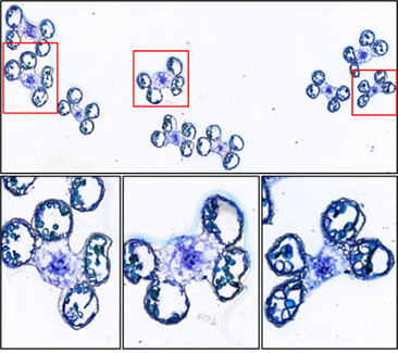 The sectioning results showed that using Sakura OCT for embedding easily led to separation between the material and the embedding medium, resulting in material detachment and folding (Figure 1). In contrast, the sectioning effect using Neg-50 is shown in Figure 2, with the overall morphology of the anthers being good. Therefore, Neg-50 was chosen for subsequent embedding.